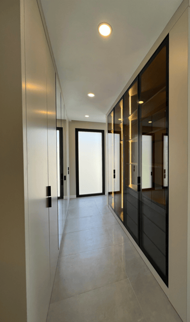 Villanın her banyosu, farklı renk ve doku kombinasyonlarıyla özgün kimlikler kazandı. Projede sıcak ve enerjik tonlardan doğal ve sade yüzeylere kadar uzanan bir renk paleti tercih ederek, mekanlarda hem dinamizm hem de dinginlik hissi yarattık.