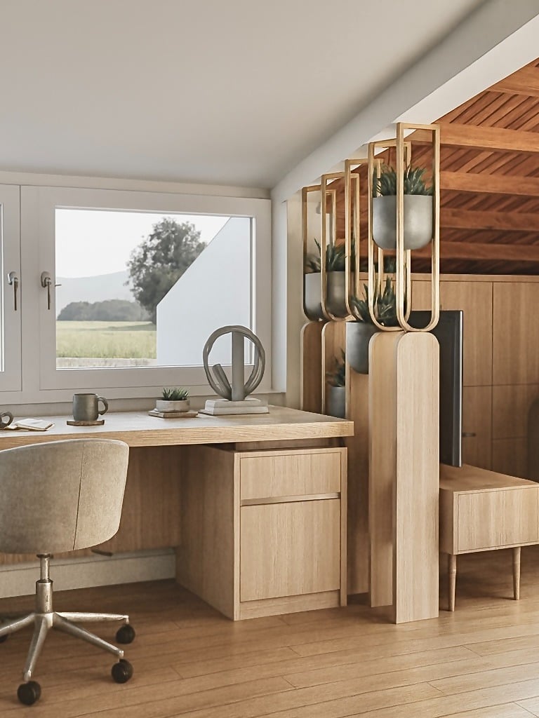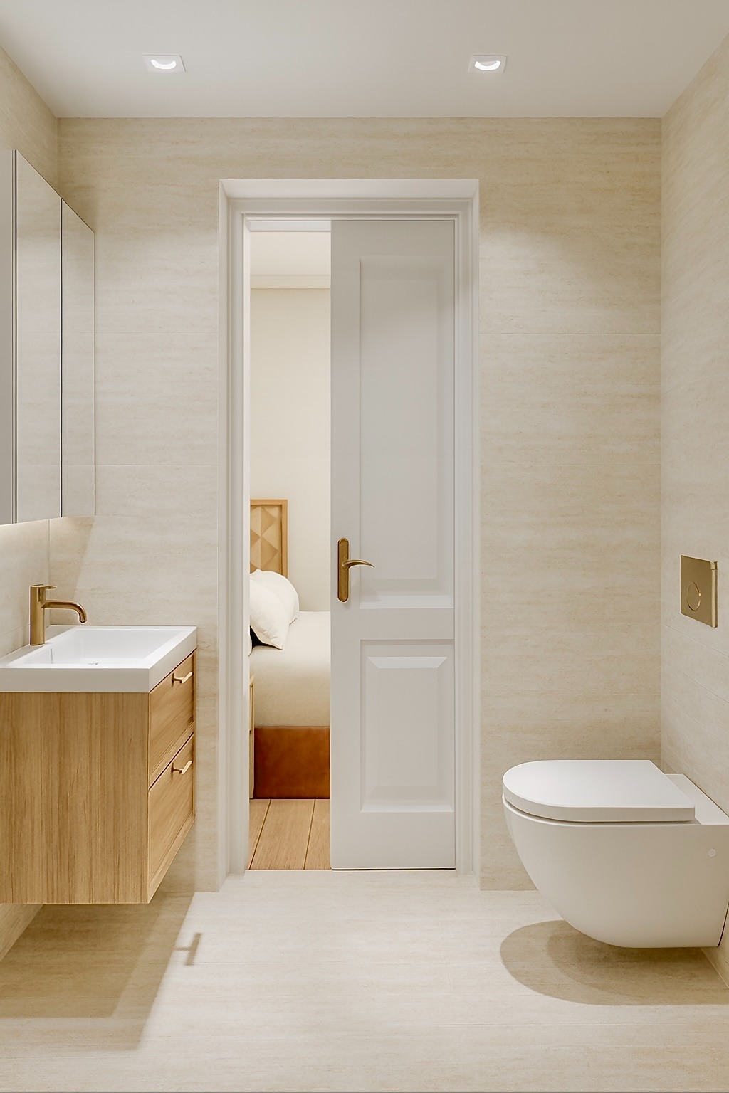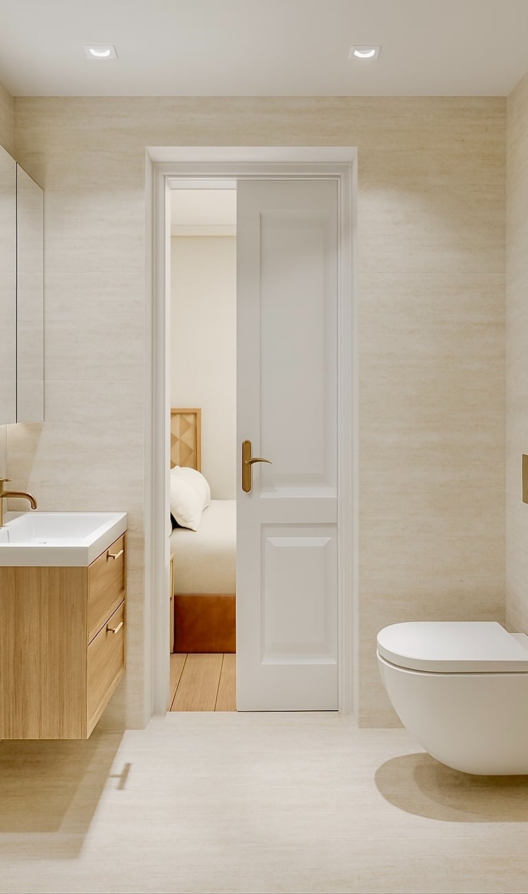 Projede, doğal malzeme kullanımı ve sıcak tonların birlikteliğiyle dingin ve zarif bir atmosfer hedefledik. Meşe dokular, bej ve krem tonlarıyla buluşarak iç mekandan süreklilik ve bütünlük sağladık. Tasarımın ana omurgasını yalın çizgiler, doğal ışık kullanımı ve dengeli bir malzeme paletiyle oluşturduk.